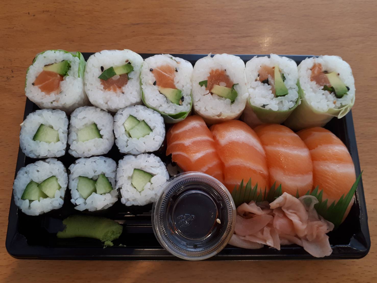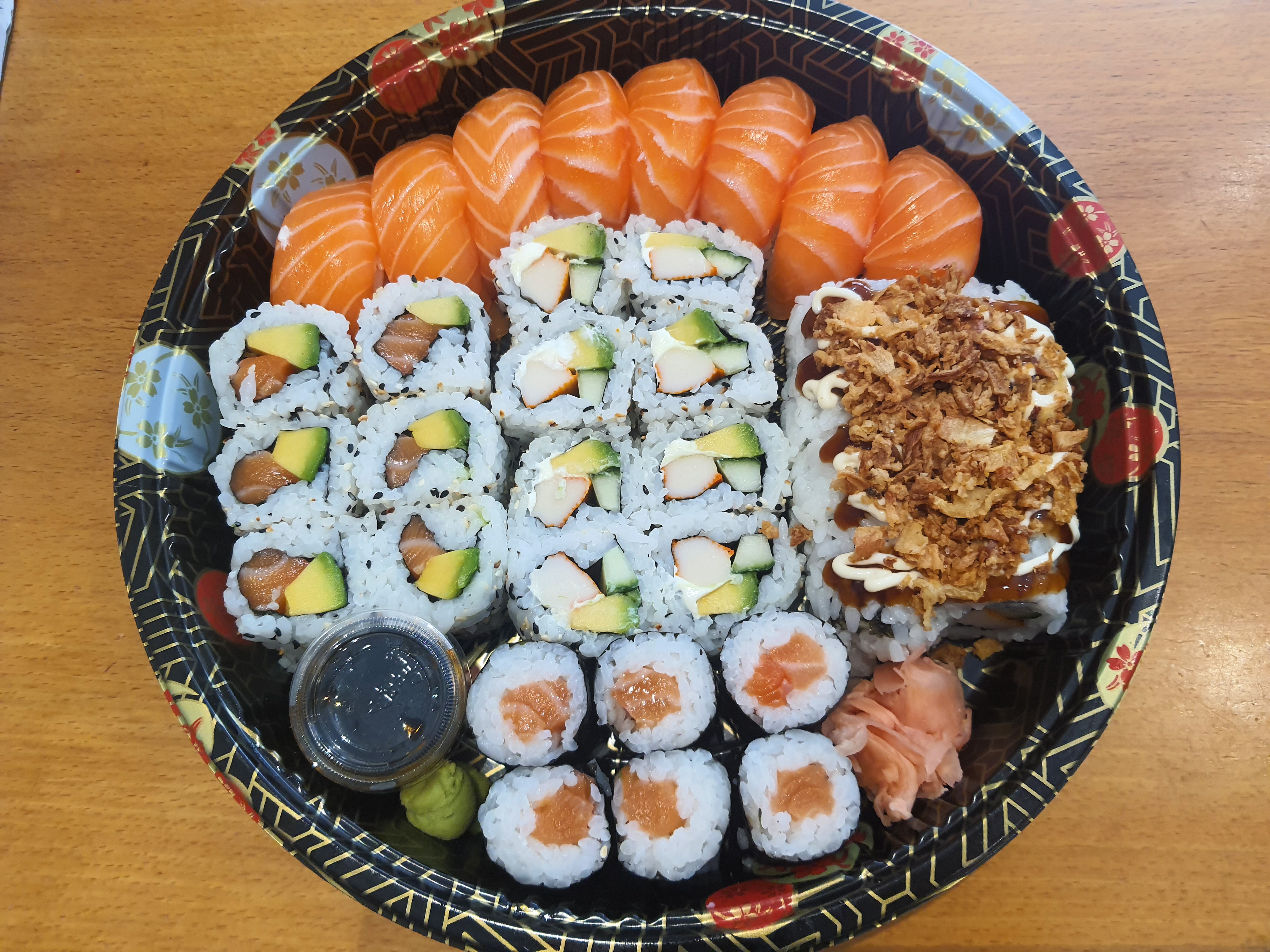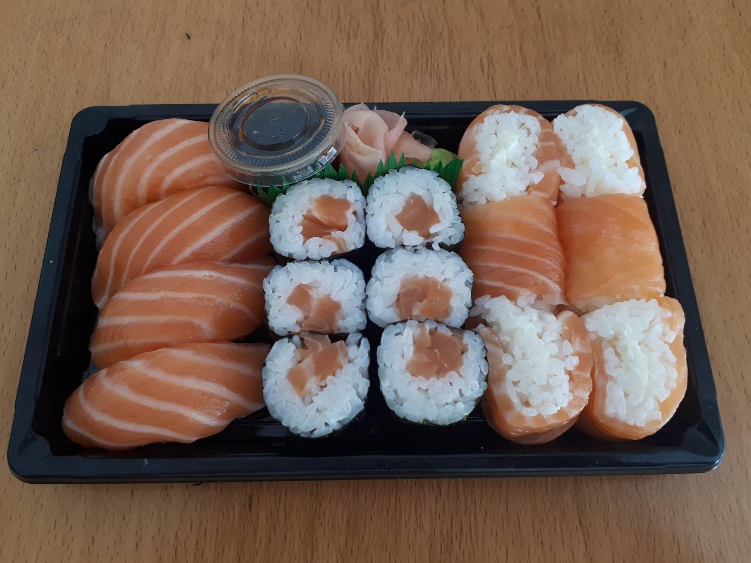 8 nigiris saumon , 6 makis saumon, 6 makis saumon et avocat, 8 makis aux oignons, 8 makis fromage frais surimi, Dessert (nougat) 3-4 personnes