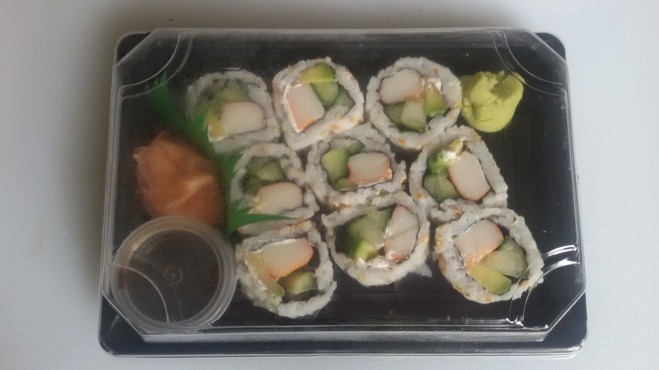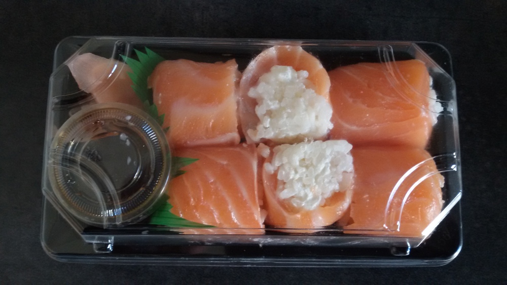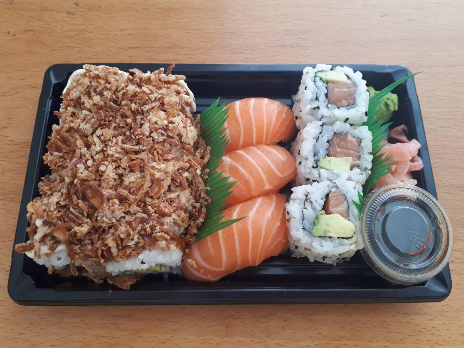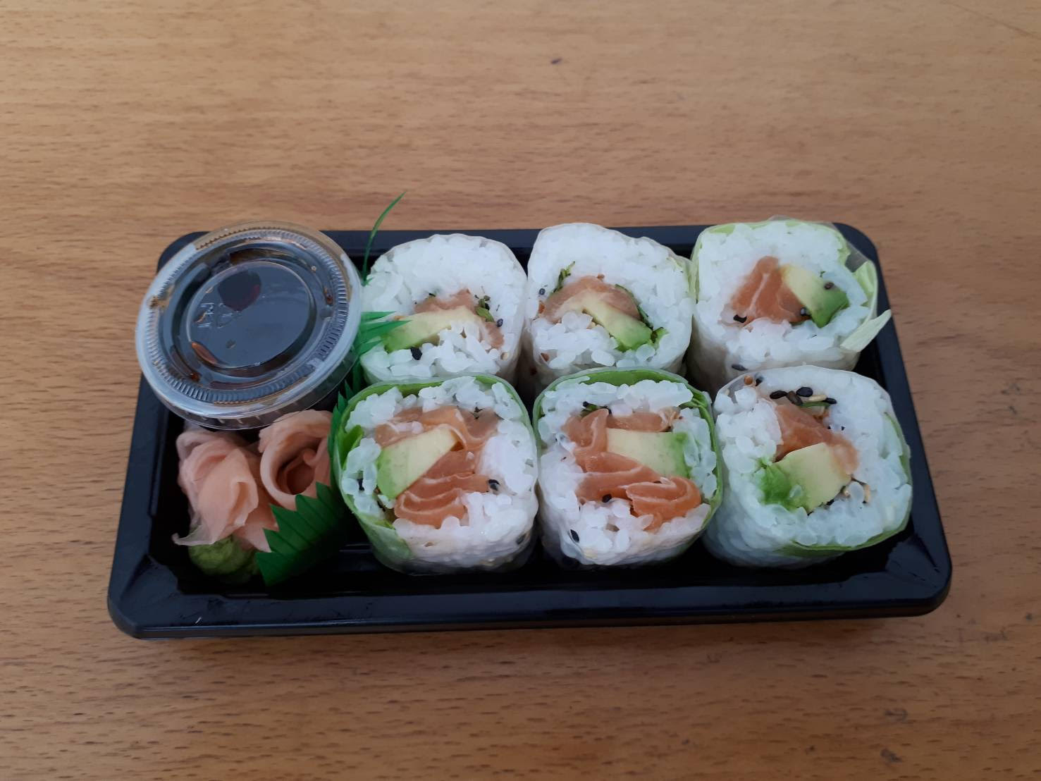 6 makis au saumon et à l'avocat, 8 bouchées de rouleau oignons et 9 makis épicés